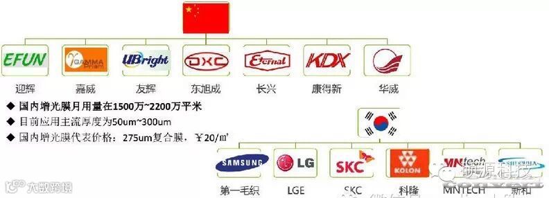 增光膜市场基本由台系、韩系、中系厂家占据;但主流厂家为台系、韩系,中系厂家在这个产品的功能提升上仍需努力。
