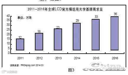从全球LCD背光模组用光学膜需求量来分析,2011年全产能约12万吨,2013年为23万吨,2014年为29万吨,到了2016年将达到36万吨。据专家预测,未来3年,全球平板显示产业对光学级聚酯基膜的年需求量将达到30万吨以上。