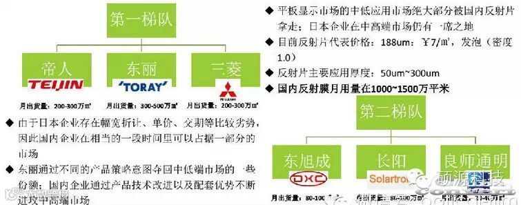 国外品牌仍占据国内一线品牌部分份额,例如惠和、SKC、新和;这些厂家占据国内平板显示市场,如三星、LG、夏普、Amtran、Vestel、Wistron等的绝大部分份额。国内厂家如激智、乐凯、东旭成已经导入国外厂家,但订单不多。