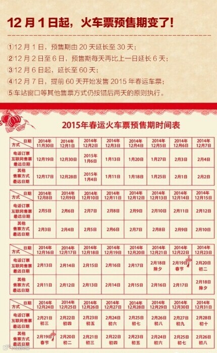 2014年11月15日,中国铁路总公司发布消息,将从12月1日起,用一周时间,逐步将铁路互联网售票、电话订票的预售期,由目前的20天延长至60天。需要退票的旅客可按原阶梯退票办法执行,改签后的车票乘车日期在春运期间的,退票时收取20%的退票费。