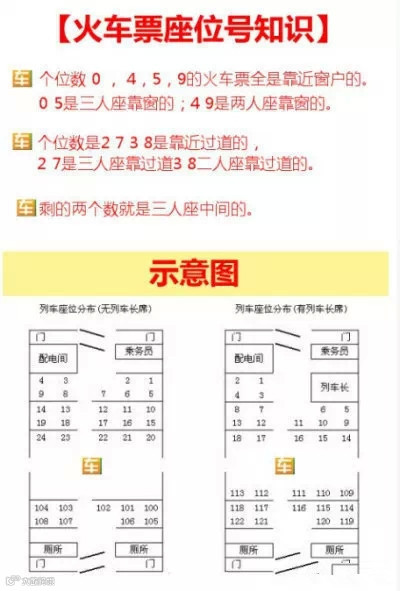 【火车票座位号小知识】个位数 0,4,5,9的火车票全是靠近窗户的。0 5是三人座靠窗的;4 9是两人座靠窗的。个位数是2 7 3 8是靠近过道的,2 7是三人座靠过道3 8二人座靠过道的。剩的两个数就是三人座中间的。不知道的转走吧!