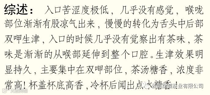 条形粗壮,显芽,高锐香气,古树浓厚内质,浓稠水感,回甘生津,后期陈化好