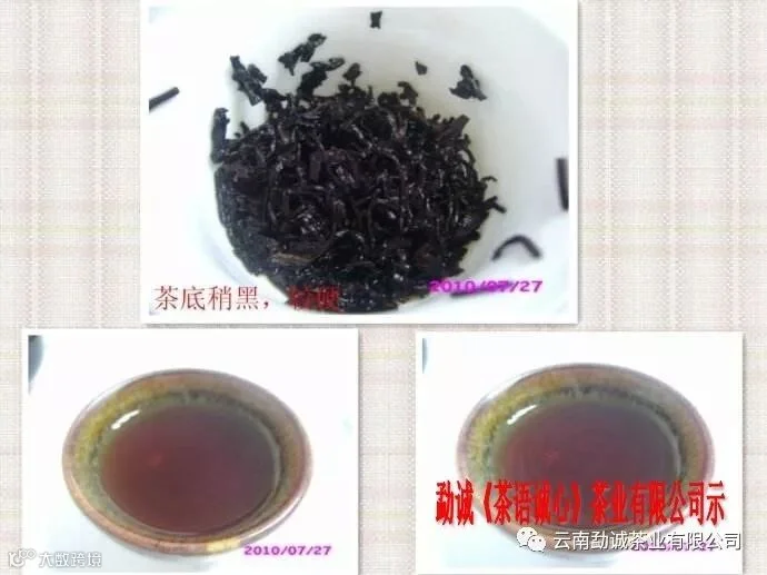 4,叶底。从叶底辨别干仓普洱茶的叶底是栗黄色至深栗色,质地活性柔软,其生茶的叶底,在干仓长期陈化过程中,颜色变化不大。湿仓普洱茶的叶底,是暗栗色或者黑色。