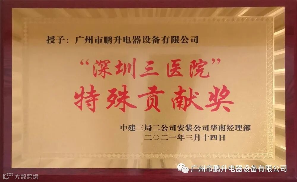 近期,在中建三局二公司安装公司华南经理部举办的2021年物质供应商暨表彰会上,广州市鹏升电器设备有限公司荣获“深圳三医院”特殊贡献奖。