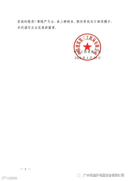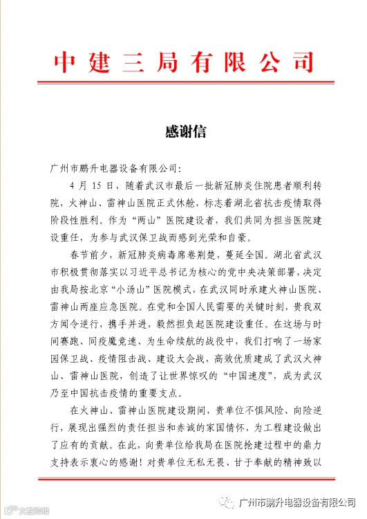 4月20日,广州市鹏升电器设备有限公司收到一封来自湖北武汉中建三局的一封感谢信。信中指出,我司配合中建三局在党和全国人民需要的关键时刻,闻令逆行,携手并进,担负起医院建设重任。