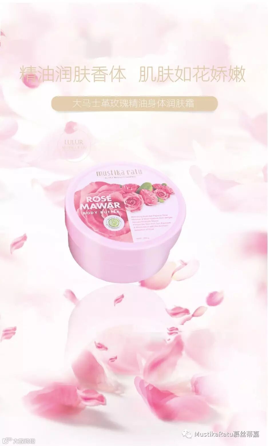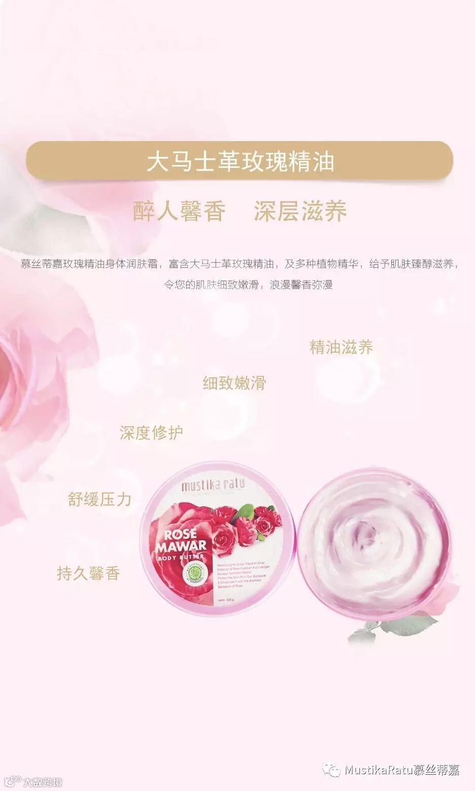 Mustika Ratu身体润肤霜秉承一贯的草本植物配方。其中玫瑰精油系列,添加了顶级的大马士革玫瑰精油;含有300多种营养成分,比其他玫瑰品种多了80余种。玫瑰精油淡化斑点、抗衰老、促进新陈代谢、细胞再生、血液循环;更是肌肤天然的保湿剂;精油的渗透力将营养充分注入肌底,娇嫩如你所想,芳香萦绕心间!