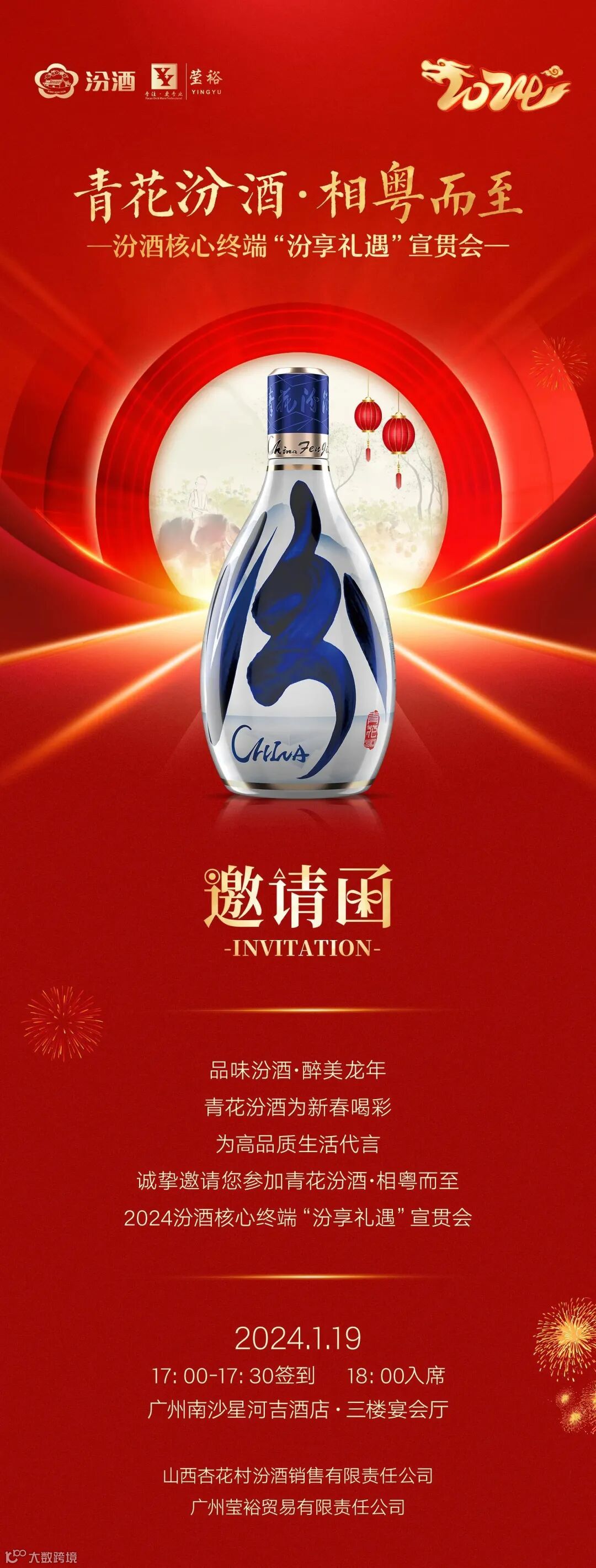 再一次衷心感谢您在过去一年里的支持与信任!是您与我们共同应对了这些挑战!为感恩回馈,我们特定于2024年1月19日18:00在星河吉酒店三楼宴会厅举办2023年青花汾酒年终答谢会,届时将有精彩的节目和丰厚的奖品等着您,欢迎您的莅临,相粤而至!