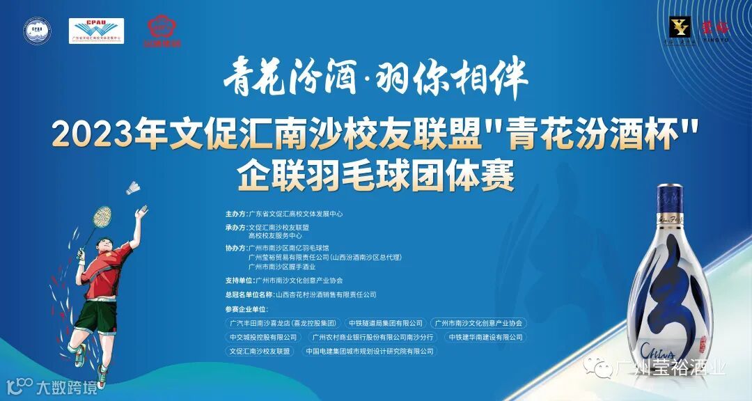 11月11日下午,由广东省文促汇高校文体发展中心主办、文促汇南沙校友联盟、高校校友服务中心承办、广州市南沙区南亿羽毛球馆、山西杏花村汾酒销售有限责任公司、广州莹裕贸易有限责任公司、广州市南沙区握手酒业共同协办的2023年文促汇南沙校友联盟“青花汾酒杯”企联羽毛球团体赛在广州市南沙区南亿羽毛球馆举行。来自南沙区的8所企业队伍48名选手相聚南亿,挥洒汗水、团结拼搏、竞逐荣誉。