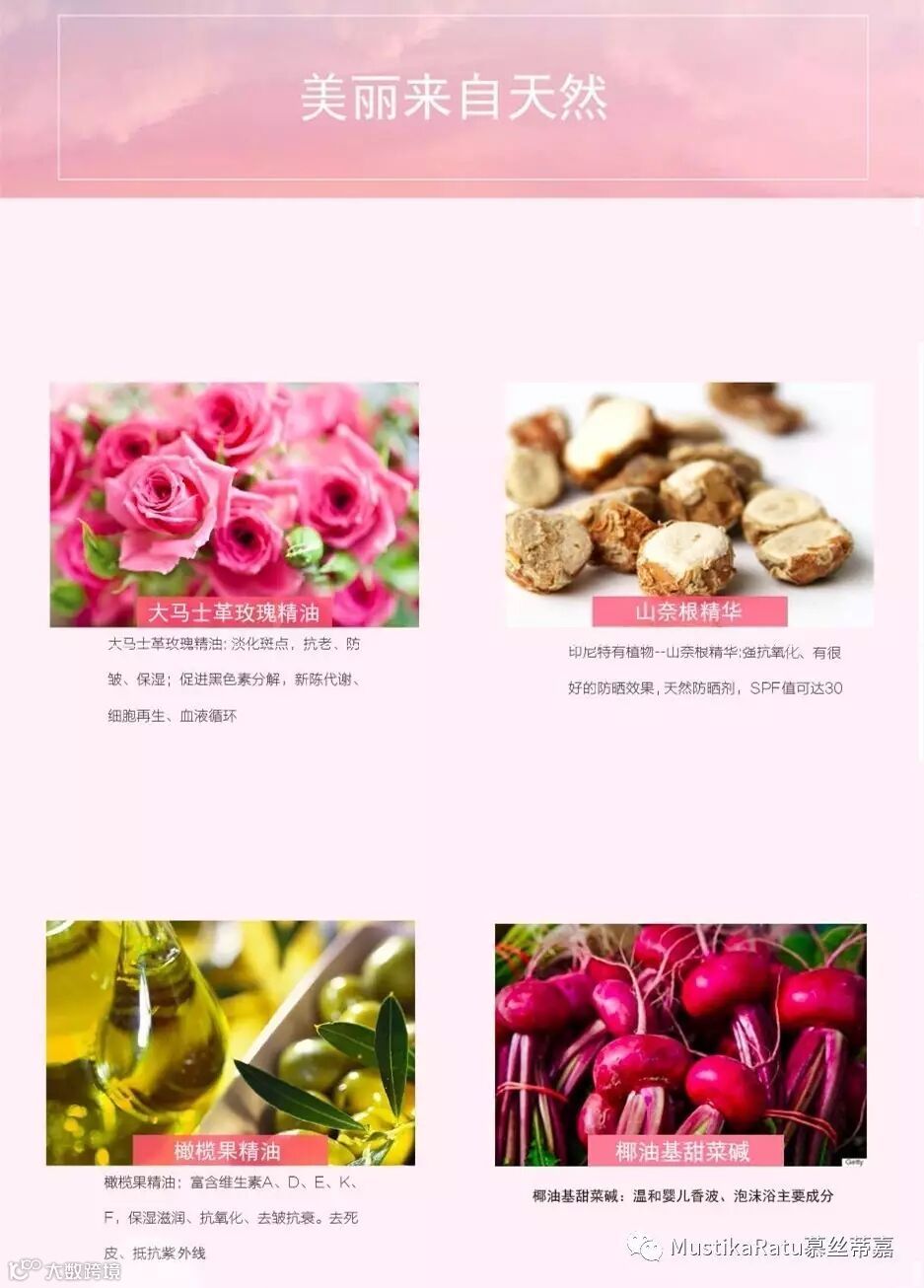 Mustika Ratu身体护肤系列沐浴露,除了玫瑰精油、橄榄果精油,以及当地特色植物山奈根精华;在起泡物的选材上,使用了椰油基甜菜碱,这是只有婴儿沐浴用品中才使用的物质。温和不刺激!