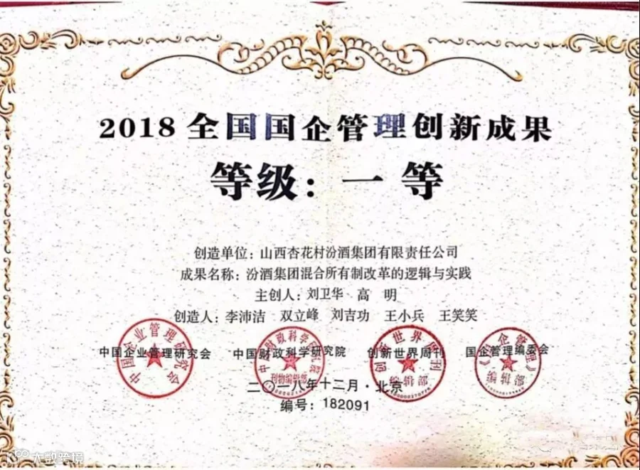 ▲12月15日,在改革开放四十周年纪念大会即将召开之际,以“开创国企改革新局面——从谋划走向实干”为主题的2018国企管理年会在北京会议中心举行。汾酒集团申报的“汾酒集团混合所有制改革的逻辑与实践”项目获得“2018全国国企管理创新成果”一等奖。