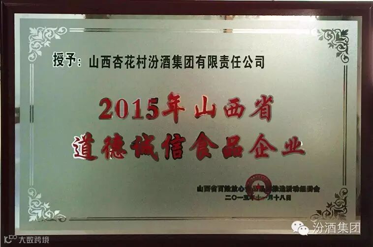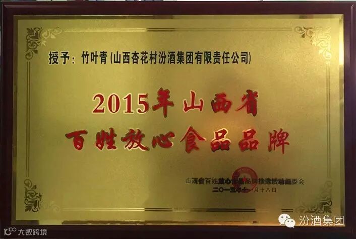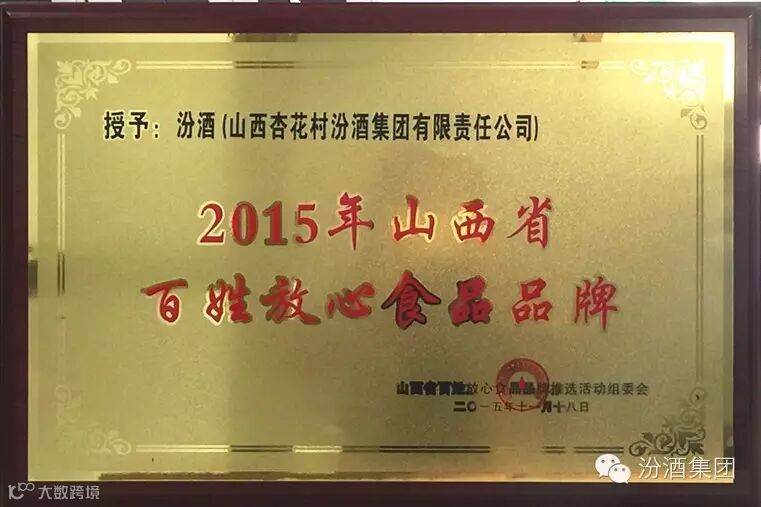 在此次2015年山西省百姓放心食品品牌推选活动中,我公司汾酒、老白汾酒、竹叶青酒、杏花村酒荣获“2015年山西省百姓放心食品品牌奖”,山西杏花村汾酒集团有限责任公司荣获“2015年山西省道德诚信食品企业奖”。这些奖项的获得体现了山西百姓对汾酒品牌的放心和忠诚,体现了一个企业的责任和诚信。