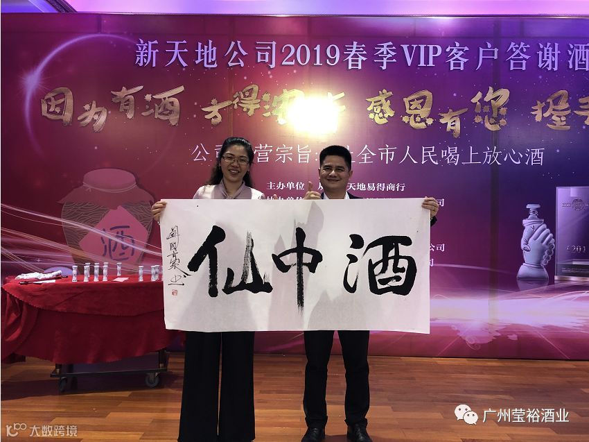 本次晚会由广州市旗美裕酒业有限公司提供的汾酒集团握手原液酒全场大力赞助与支持。汾酒集团握手原液酒瓶创始人谭健蓉女士和广州市旗美裕酒业有限公司总经理姜丽更亲临现场向新天地公司范总道贺。