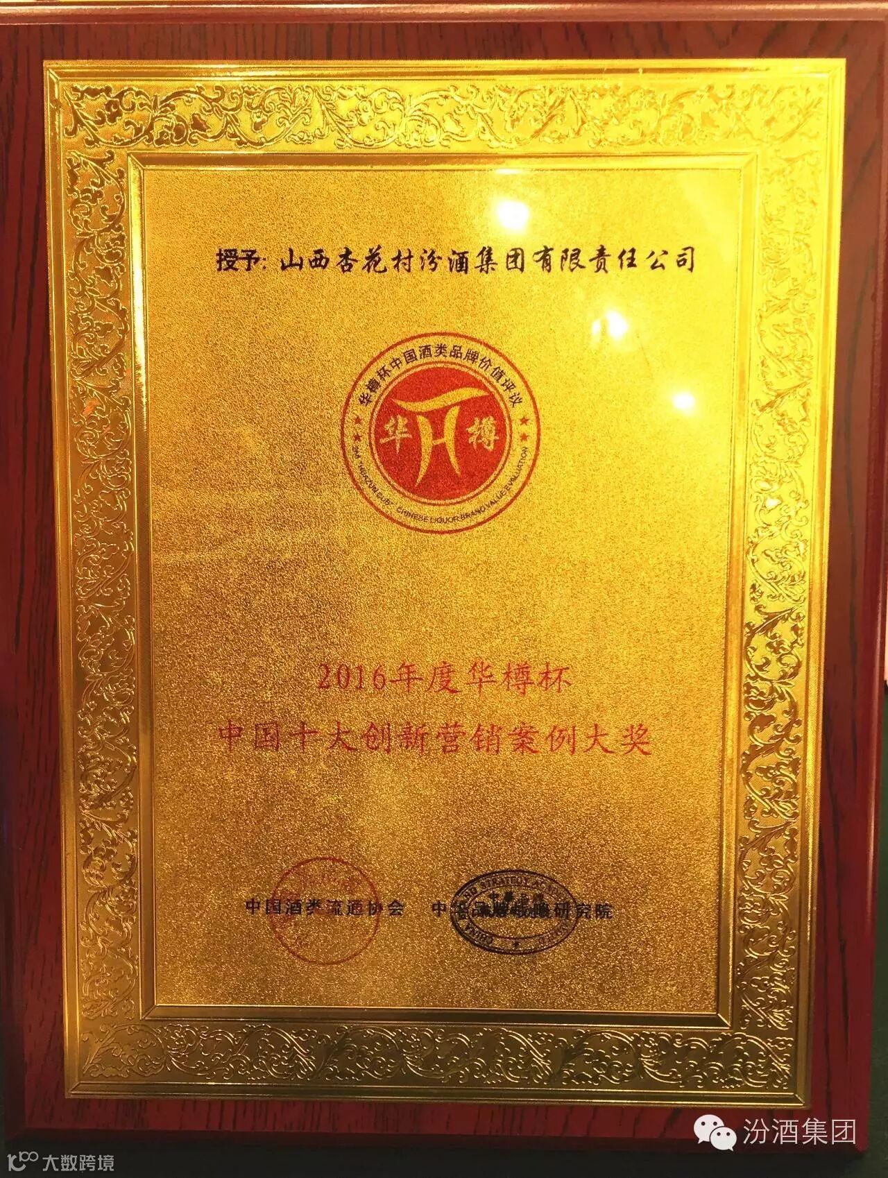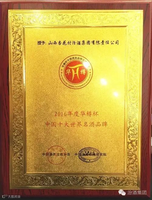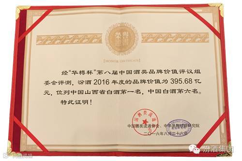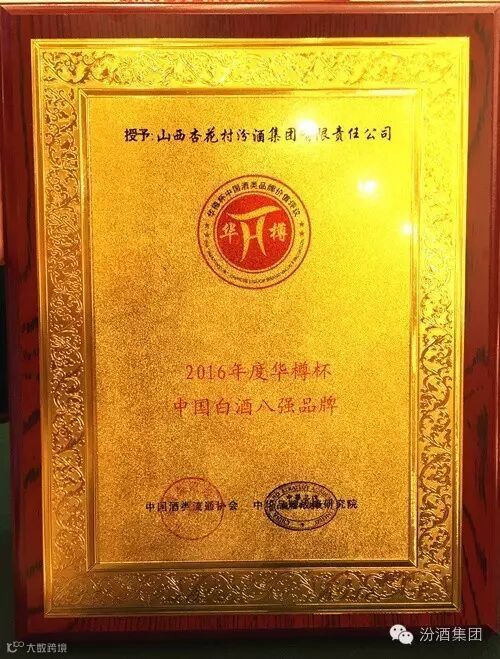 汾酒还荣获2016年度华樽杯中国白酒8强品牌;2016年度华樽杯中国十大世界名酒品牌;2016年度华樽杯清香型白酒品牌价值第一名;2016年度中国十大创新营销案例大奖
