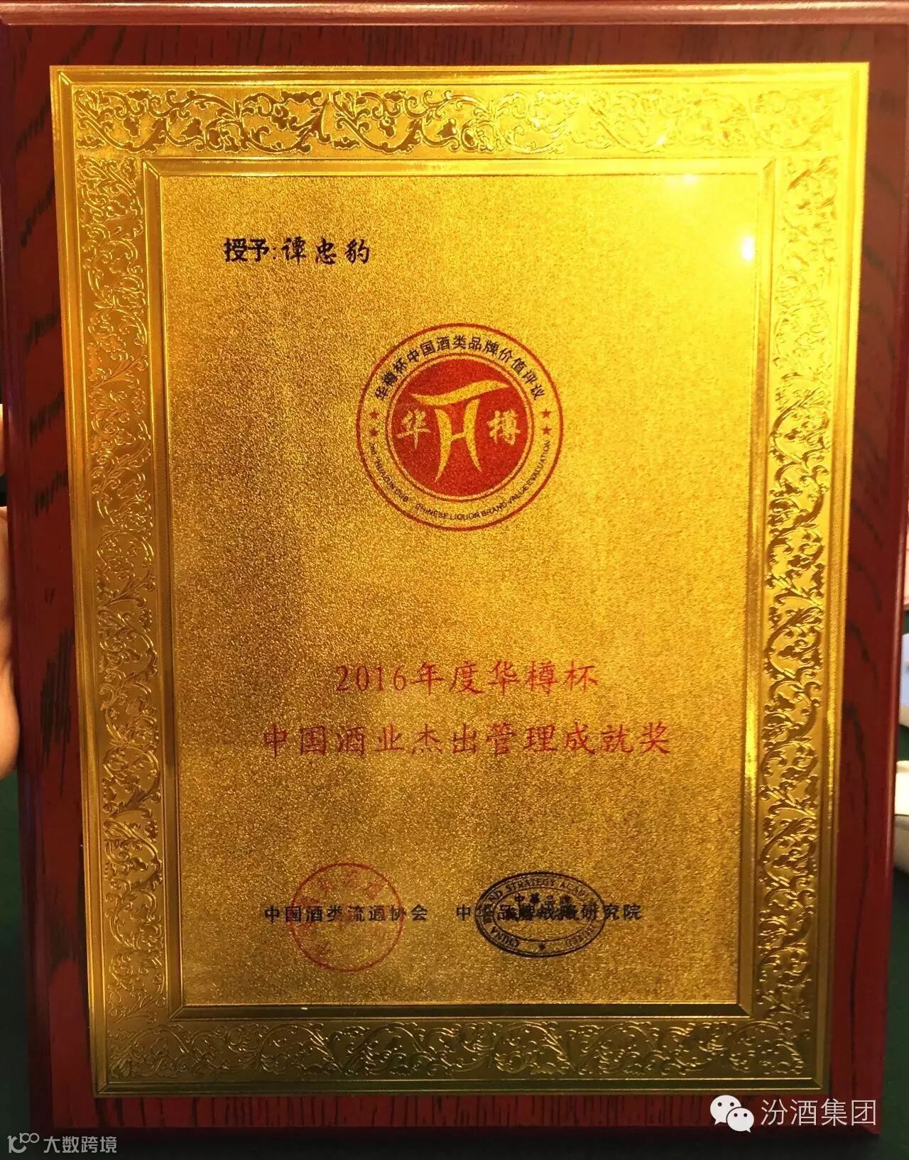 汾酒集团总经理谭忠豹荣获2016年度华樽杯中国酒业杰出管理成就奖