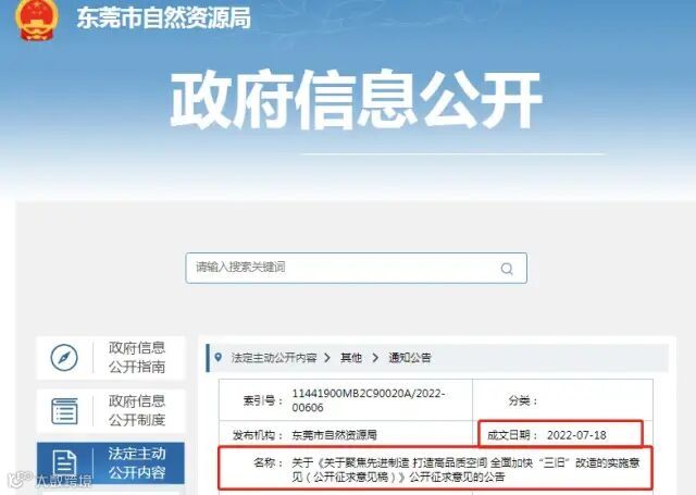 2022年7月18日,东莞市自然资源局在其官网发布了关于《关于聚焦先进制造 打造高品质空间 全面加快“三旧”改造的实施意见(公开征求意见稿)》公开征求意见的公告,提出优化规划和流程体系,高效赋能引领“三旧”改造。