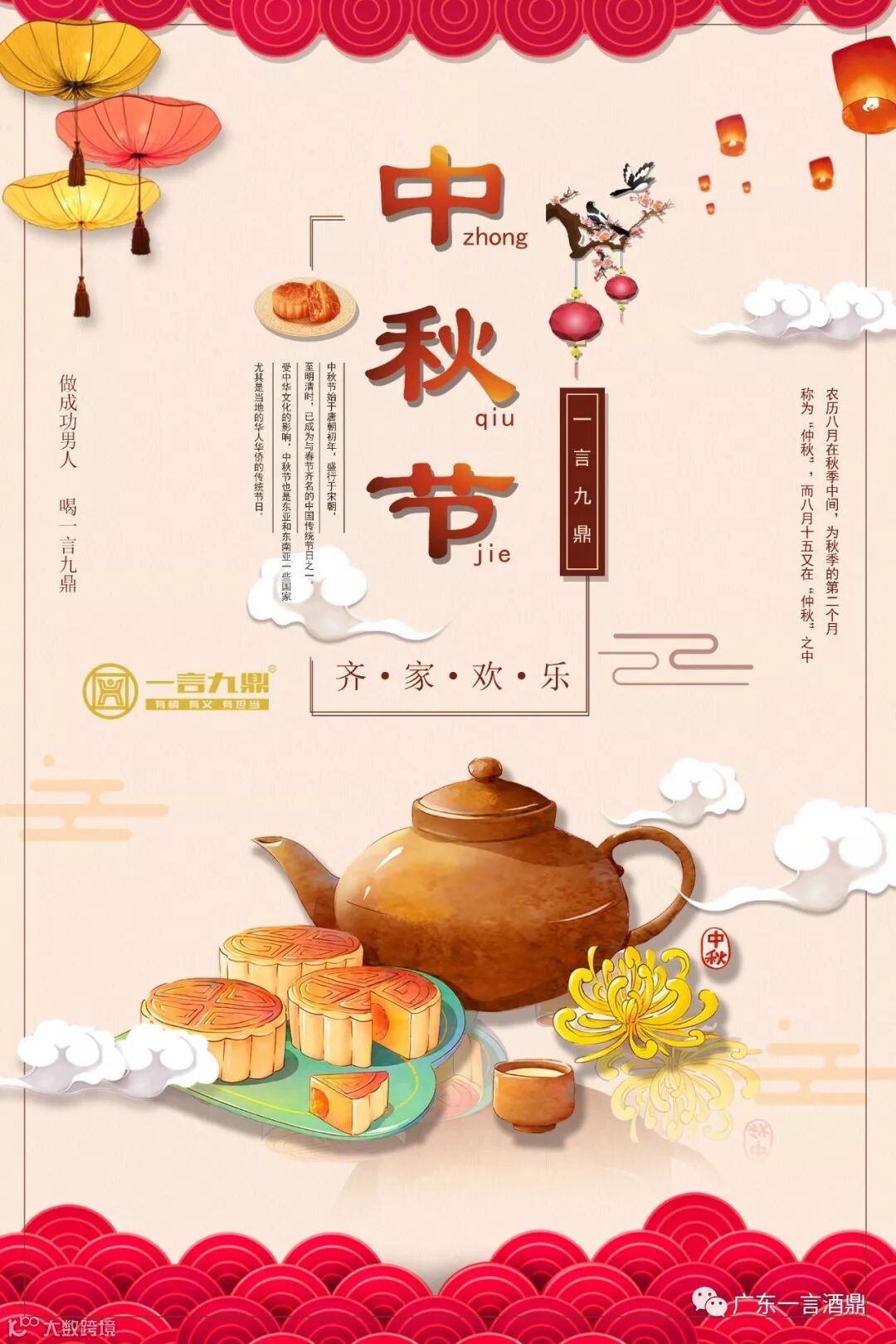 明月九霄挂,清风八方来。四季悄声过,一年明镜台。中秋幸福日,八月团圆牌。举杯邀明月,低头乐开怀。祝福随风至,好运踏月来。
