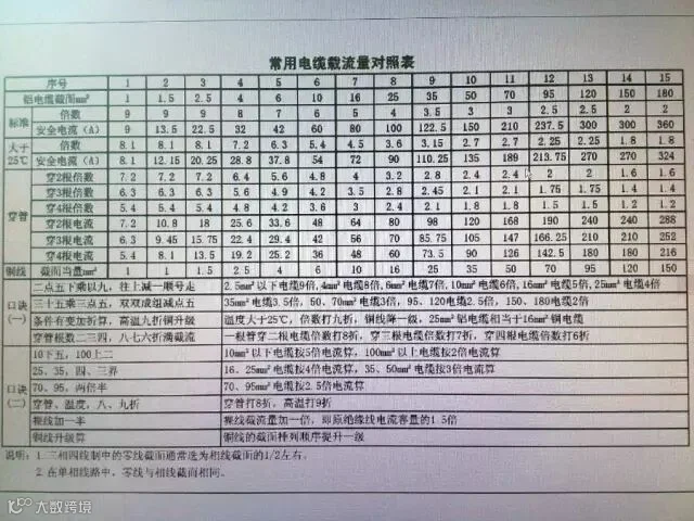 “100上二”(读百上二)是指截面100以上的载流量是截面数值的二倍。截面为25与35是四倍和三倍的分界处。这就是口诀“25、35,四三界”。而截面70、95则为二点五倍。从上面的排列可以看出:除10以下及100以上之外,中间的导线截面是每两种规格属同一种倍数。