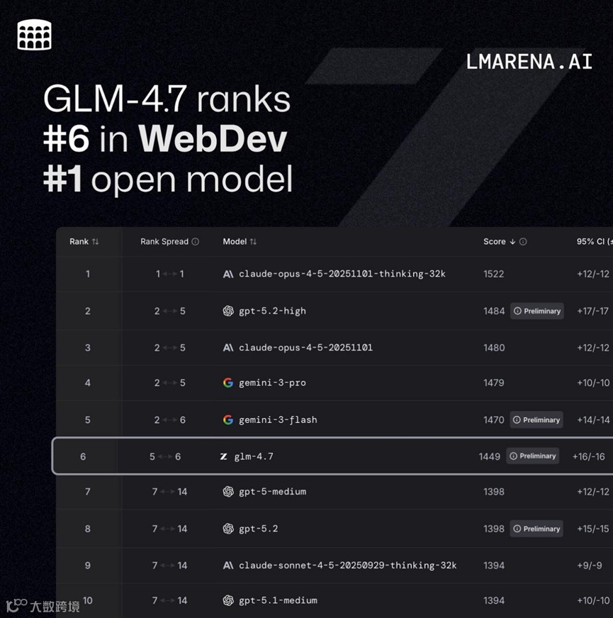 另外,在全球百万用户盲测的权威编码榜单Code Arena上,GLM-4.7 位列全球开源第一、国内第一,超过了GPT-5.2。