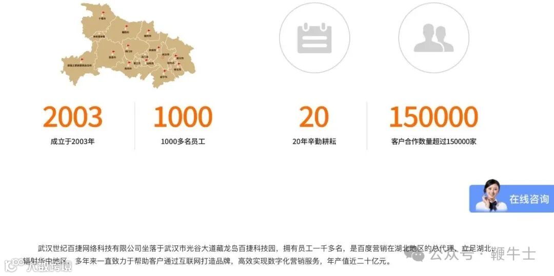 世纪百捷也在官网提到,自己是百度营销在湖北地区的总代理,立足湖北,辐射华中地区,多年来一直致力于帮助客户通过互联网打造品牌,高效实现数字化营销服务,年产值近二十亿元。