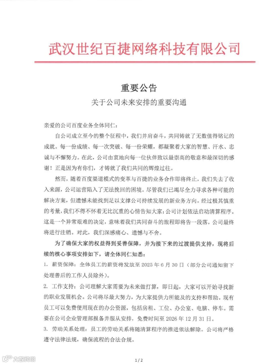 此前有媒体曝出,2025年Q3季度,百度区域代理变动,原济南/重庆/武汉/福州/厦门/泉州区域代理,从7月1日起陆续变更为百度服务商运营模式。武汉世纪百捷宣布解散,侧面证实了此消息的真实性。