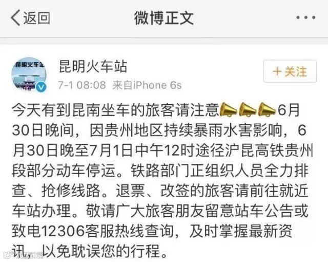 6月30日下午14时左右,沪昆高铁贵定处白岩脚隧道导流洞塌方,大量水涌入正洞,导致沪昆高铁无法正常运行。