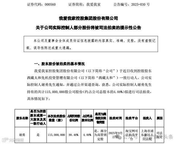 8月21日,地产中介巨头我爱我家发布公告:公司实际控制人谢勇先生持有的1.15亿股公司股份(约占公司总股本的4.88%)将于9月27日进行司法拍卖。