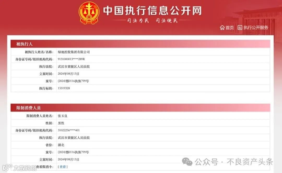 9月19日多家媒体消息:眼查信息显示了绿地控股集团有限公司及其法定代表人、董事长张玉良因未履行生效法律文书确定的给付义务,被武汉市黄陂区人民法院限制高消费。