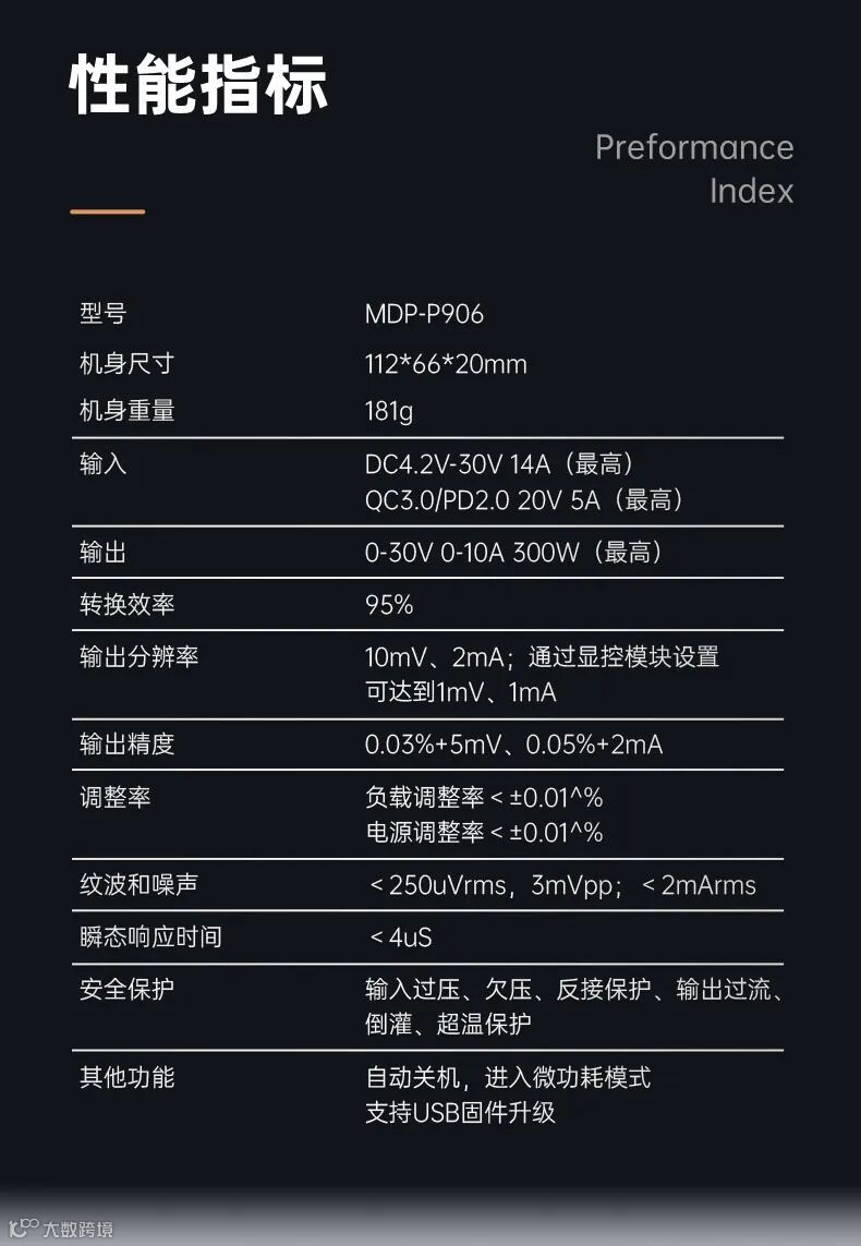 比起上一代的MDP-P905,从外观上乍一看,这款MDP-P906最明显的不同之处是高度增加了7mm(多了四条可爱的小短腿)~在性能上,功率足足提升了230%!95%高效线性输出,最高可达300W(DC 0-30V 0-10A)~性能up!Up!Up!看似巴掌大小的MDP-P906,里面可是蕴含了大大的“能量”哦~