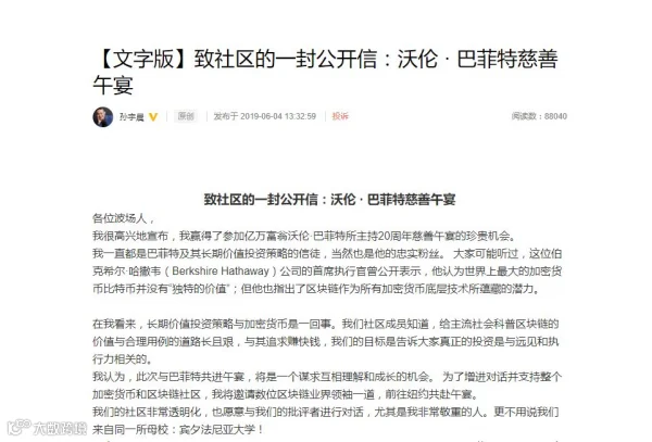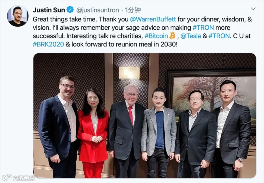 饭前,他还发布了一封给波场社区(持有波场币的投资者交流社区)的一封公开信,称坚信通过适当的理解和沟通,巴菲特将转变他对加密货币和区块链的总体立场,将这一新的投资策略融入自己的投资组合。