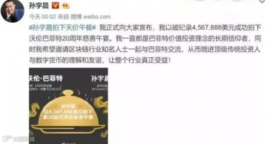 值得注意的是,2019年7月,孙宇晨还曾因豪掷破纪录的457亿美元(约合人民币3300万元)买下巴菲特的午餐后一度“爽约”而名噪一时。