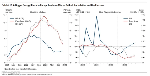 反过来,高通胀将对实际收入、消费和工业生产产生负面影响。高盛预计,明年一季度欧元区实际收入将进一步下降1.5%,明年二季度英国实际收入将下降3%。