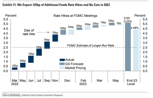 恰恰相反,高盛将美联储峰值上调25基点,至5%-5.25%的区间。高盛指出: