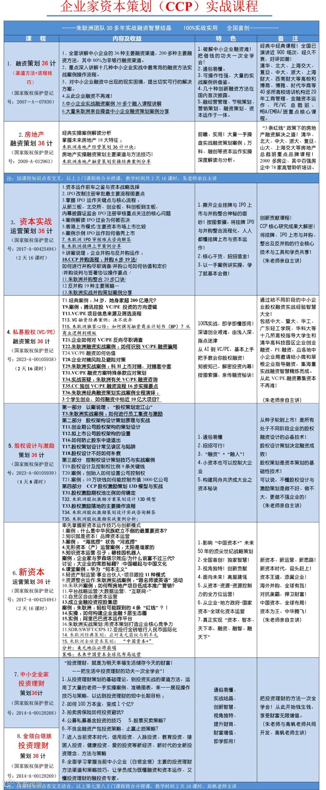 与名师面对面,帮您解决融资难题。学习资本策划CCP,就有机会获得我国著名融资实战策划专家朱耿洲老师的亲自指点!朱老师破解融资困局三十年四千例,被企业家誉为“中小企业融资实战策划第一人” !其融资策划方法创新高超、实战可用、一招破局。这样,既可以学到知识,又能解决企业融资难题,又可结识名师,真正物超所值!