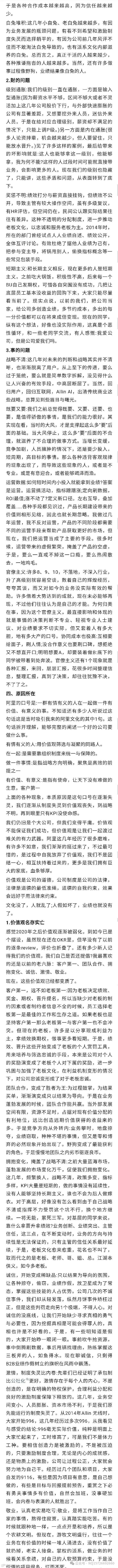 他认为,阿里要回到“一群有情有义的人在一起做一件有价值、有意义的事。”的口号中,重整文化建设,强调客户第一、团队合作、战略清晰、激情敬业等,重整HR体系、改革管理体制、清除“草台”中高层、职级公开统一、绩效晋升公示、减冗余停业务、弱运营求真相等,并祝愿AI来了,阿里接住这一时代。