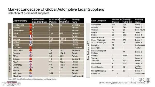 S&P Global 划分的9家头部激光雷达厂商中,有4家中国厂商(速腾聚创、华为、禾赛科技、大疆)
