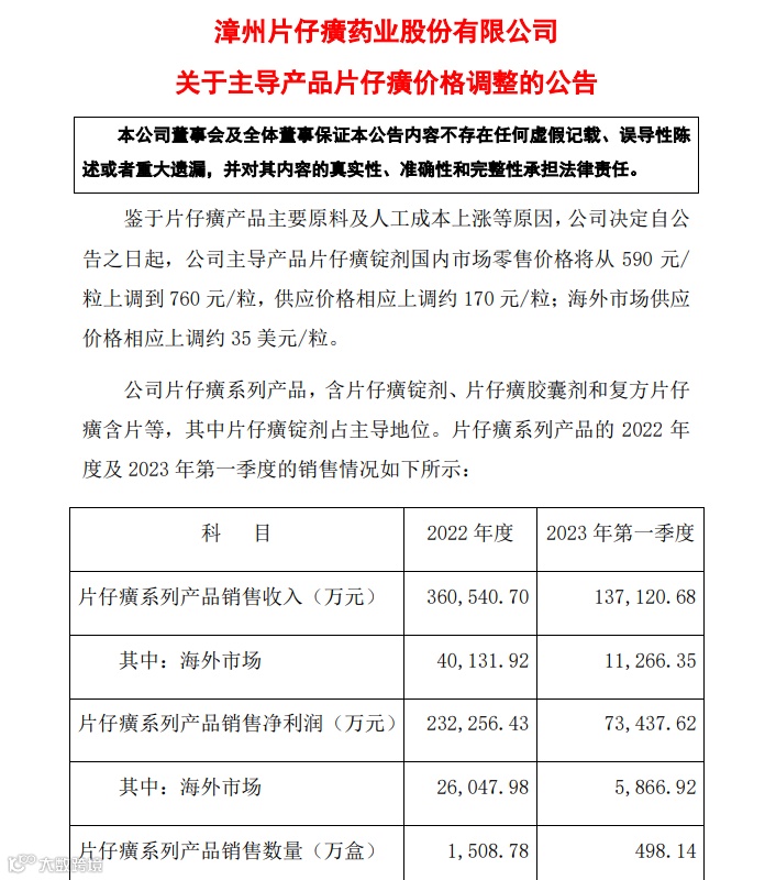 5月5日,片仔癀发布公告,鉴于片仔癀产品主要原料及人工成本上涨等原因,公司决定自公告之日起,公司主导产品片仔癀锭剂国内市场零售价格将从590元/粒上调到760元/粒,供应价格相应上调约170元/粒;海外市场供应价格相应上调约35美元/粒。