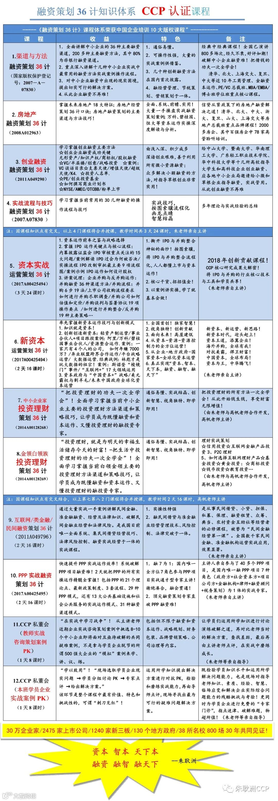 与名师面对面,帮您解决融资难题。学习资本策划CCP,就有机会获得我国著名融资实战策划专家朱耿洲老师的亲自指点!朱老师破解融资困局三十年四千例,被企业家誉为“中小企业融资实战策划第一人” !其融资策划方法创新高超、实战可用、一招破局。这样,既可以学到知识,又能解决企业融资难题,又可结识名师,真正物超所值!