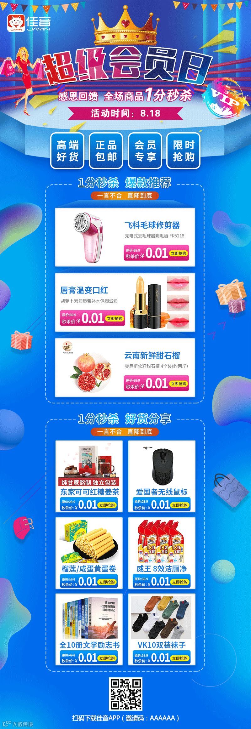 在佳音818“1分秒杀”活动专区购物,即可享受所有商品1分钱包邮到家,每位“佳音超级会员”可享受3单。超会专场福利,1000+款优质精品,限时限量抢购,先到先得。