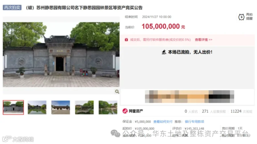 近日,曾号称“江南第一私家园林”的静思园被挂上阿里拍卖,起拍价为1.05亿人民币,经过一天的竞价拍卖,最终流拍。