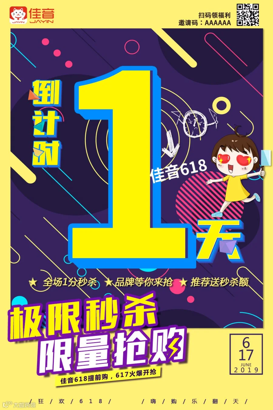注意!注意!佳音年中大促(6月17日),“1分秒杀”特惠活动马上开始(倒计时1天)!商品更多、福利更大,既不需要绑定支付宝账户,返现也无需抵扣现金券,超级嗨皮!活动限时又限量,拼的是手速,靠的是网速,赶紧下载佳音(邀请码:AAAAAA)蹲点抢货吧!