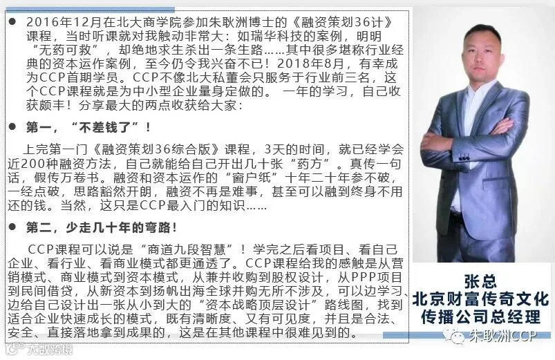 与名师面对面,帮您解决融资难题。学习资本策划CCP,就有机会获得我国著名融资实战策划专家朱耿洲老师的亲自指点!朱老师破解融资困局三十年四千例,被企业家誉为“中小企业融资实战策划第一人” !其融资策划方法创新高超、实战可用、一招破局。这样,既可以学到知识,又能解决企业融资难题,又可结识名师,真正物超所值!
