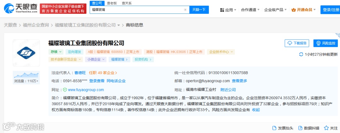天眼查显示,福耀玻璃工业集团股份有限公司,成立于1992年,位于福建省福州市,是一家以从事汽车制造业为主的企业。法定代表人为曹德旺。
