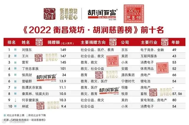 王兴过去一年共捐赠147亿元,位列第二。雷军过去一年共捐赠145亿元,位列第三。