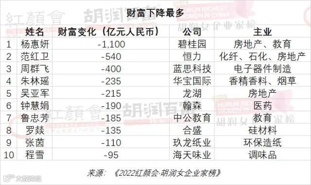 9位落榜,主要来自工业产品和大健康行业,包括中伟股份的吴小歌和康泰生物的袁莉萍等。财富缩水最多的是中国女首富碧桂园41岁的杨惠妍,缩水了1,100亿元;其次是恒力石化55岁的范红卫,缩水了540亿元。