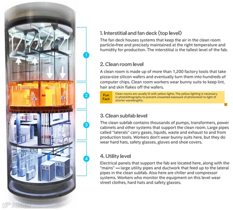 晶圆厂的核心是洁净室层(Clean room level)。实际进行制造过程的工厂车间洁净室下方是次级晶圆厂(Sub-fab),一层或多层(通常为两层),其中包含支持洁净室操作所需的管道、管道、布线和设备。洁净室层上方是一个间隙空间(Interstitial and fan deck),配有风扇和过滤器,用于将空气再循环到下面的洁净室(Utility level),其中设计成本5%,土建成本35%,机电系统成本30%,洁净室成本35%。一般7nm先进工艺以下的晶圆厂总成本超过200亿美元,其中建筑结构本身需要花费40亿至60亿美元,占总成本的10~20%,从成本角度来看,未来新晶圆厂的破土动工在前期和持续支出方面都将比几年前更加昂贵。根据统计,中国台湾建设晶圆厂大约需要19个月,新加坡和马来西亚需要23个月,欧洲约34个月,而美国最长,可达38个月。