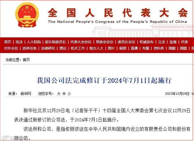 就在元旦前的两天,2023年12月29日,十四届全国人大常委会第七次会议表决通过新修订的公司法,于2024年7月1日起施行。这是全国人大常委会对公司法修订草案的第四次审议,草案四审稿进一步完善了公司出资制度,引发各方面高度关注。