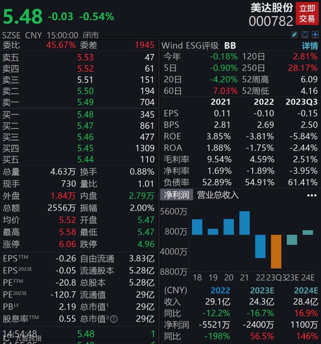 业绩方面,2023年前三季度,美达股份营收20.29亿元,同比下降9.71%;归属于上市公司股东的净利润亏损8011.77万元,同比由盈转亏,较2022年同期下降2282.93%。