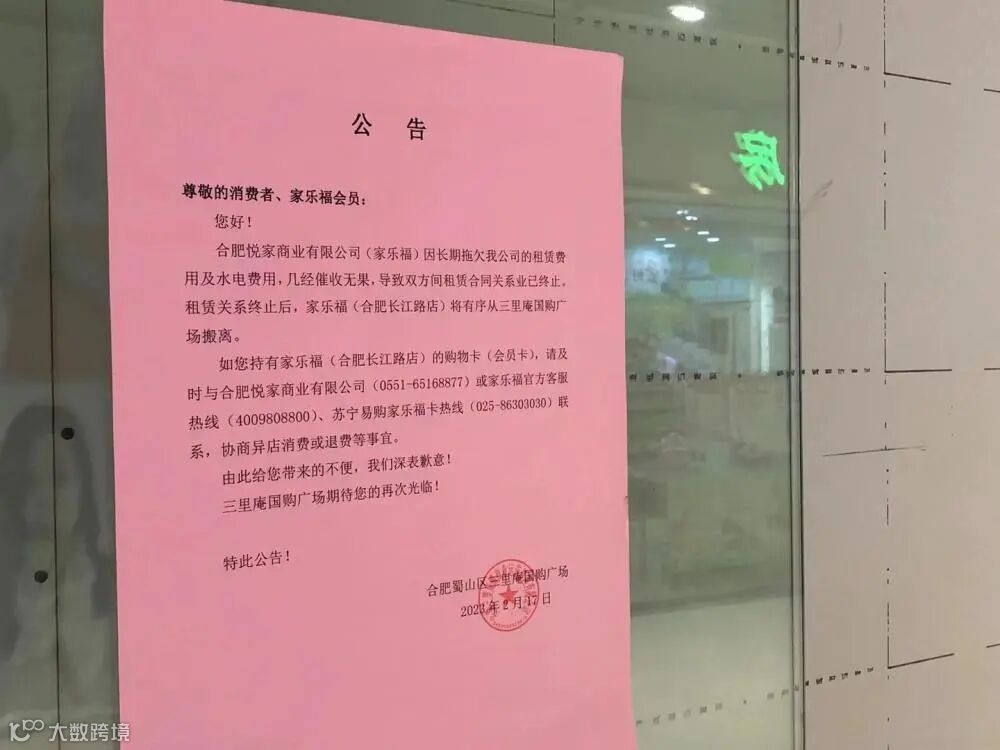 2023年2月17日,合肥市三里庵国购广场《公告》显示:家乐福(合肥长江路店)将有序从三里庵国购广场搬离。