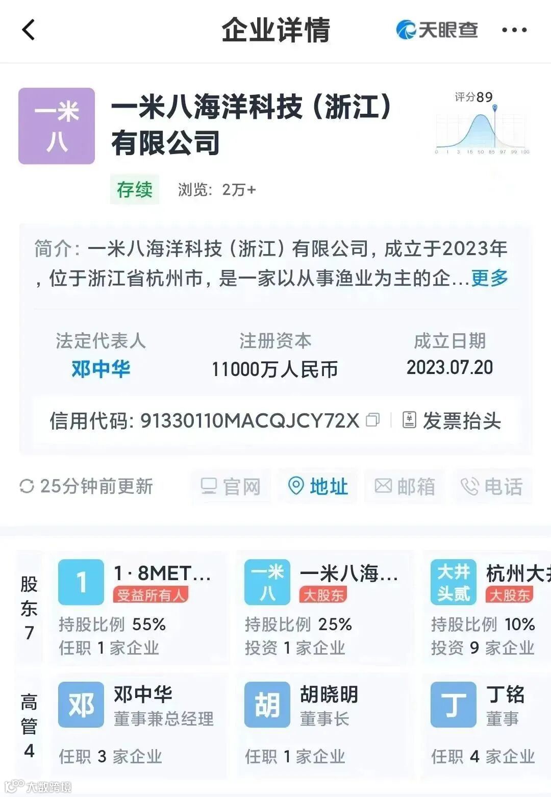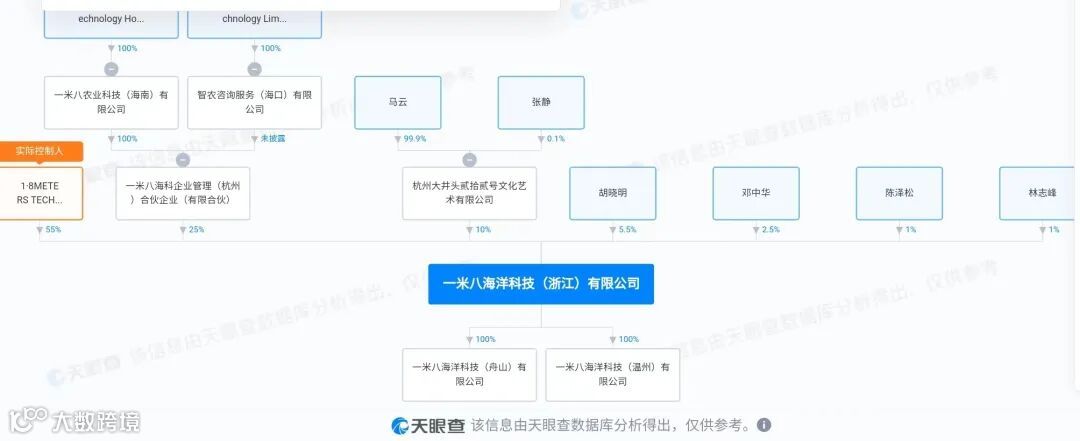 同时,天眼查信息显示,今年7月,一米八海洋科技(浙江)有限公司在杭州成立,注册资本达1.1亿元,胡晓明担任该公司董事长。而从股权穿透信息来看,杭州大井头贰拾贰号文化艺术有限公司为该公司股东之一,持股比例为10%,马云持有杭州大井头贰拾贰号文化艺术有限公司99%的股权。在另一家今年新成立的一米八食品科技(浙江)有限公司中,马云持股的杭州大井头贰拾贰号文化艺术有限公司、胡晓明持股的杭州源颂股权投资有限公司,也出现在了股东名单中。
