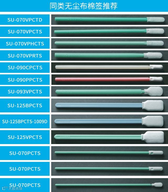 知识点:无尘棉签主要分为无尘布头棉签和聚酯海绵头棉签两种,是半导体车间、光电产品、PCB生产工艺、硬盘、精密仪器等领域被用来清洁微小部位及吸取污染液体的净化产品。